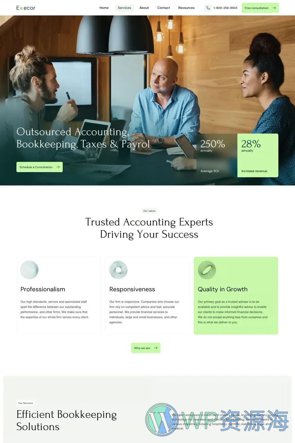 Execor 主题采用了深绿色与浅色的搭配,营造出一种专业、稳重且清新自然的视觉效果。这种配色方案不仅传达了会计和管理咨询业务的可靠性和专业性,还为整个网站带来了一种现代、时尚的气息,使其在众多竞争对手中脱颖而出。此外,主题设计简洁大气,页面布局合理,重点突出,确保用户可以轻松获取重要信息。