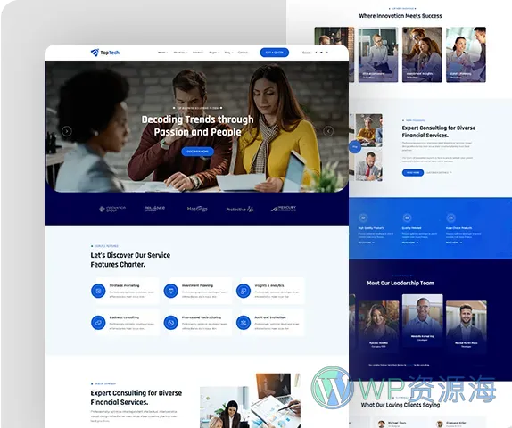 TopTech 的设计风格简洁大方,以 蓝色与白色 为主色调,辅以科技感渐变色和图标元素,传递出稳重、专业与现代感。